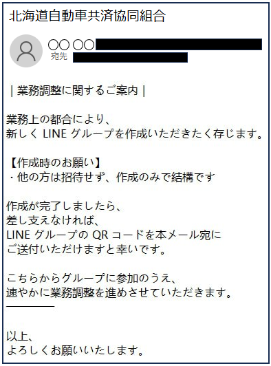 当組合からメールにて、LINEグループの作成や招待用QRコード等の送付や、勤務確認の返信を依頼することは一切ありません。